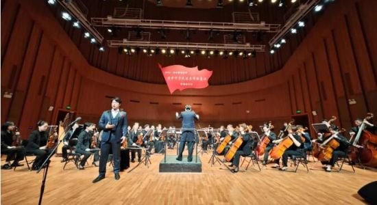 音樂會在交響樂《紅旗頌》的旋律中拉開帷幕。小號奏出的音符,把觀眾帶到開國大典上國旗冉冉升起那激動人心的時刻。弦樂奏出舒展、優(yōu)美的主題,向觀眾講述在紅旗引導下,無數(shù)英烈英勇奮戰(zhàn)、奮發(fā)向上的革命氣概和感人故事。簡短有力的圓號,豪邁而又激昂,象征著紅旗飄揚,帶領全國各族人民邁開巨人般的步伐走進新時代。蕩氣回腸的音樂深深感染了現(xiàn)場觀眾,座席上響起陣陣掌聲。