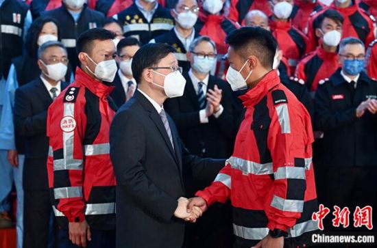 圖為香港特區(qū)行政長官李家超迎接救援隊隊員返港。 中新社記者 李志華 攝