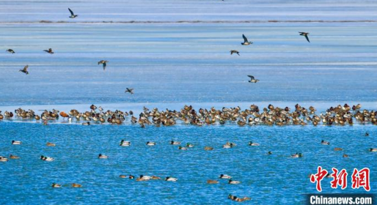 3月15日,松原查干湖候鳥在冰上覓食、休憩。 李鵬程 攝