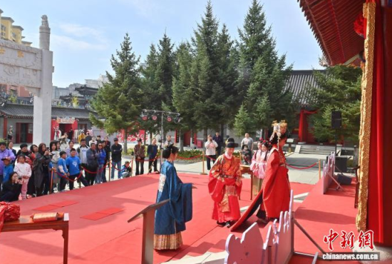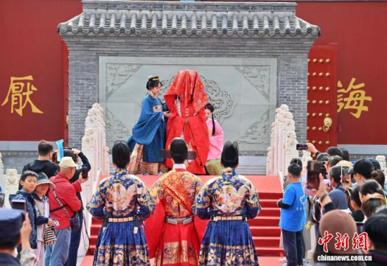 10月7日,吉林長(zhǎng)春文廟舉行了一場(chǎng)明制漢婚沉浸式展演。漢服愛(ài)好者依次呈現(xiàn)奠雁、同牢、合巹等傳統(tǒng)禮儀,生動(dòng)還原明代婚俗。現(xiàn)場(chǎng)通過(guò)流程講解與道具展示,解讀禮儀背后古人對(duì)婚姻與美好生活的寄愿。中新社記者 張瑤 攝