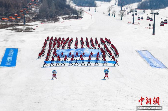 吉林中旅松花湖雪場(chǎng)的滑雪方陣展示長(zhǎng)春大冬會(huì)吉祥物!∈橛 攝