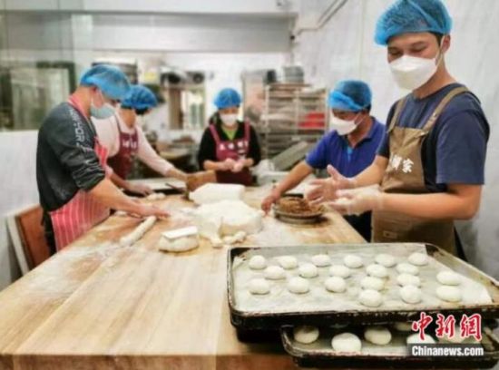 臺山市臺城美源餅屋的師傅們在制作軟餅。李曉春 攝