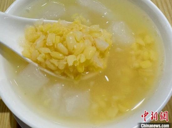 “世界糖水在中國(guó),中國(guó)糖水在廣東!睂(duì)廣州人而言,在炎熱的夏日或寒冷的冬夜,與好友相約糖水鋪,“食”上一碗滋補(bǔ)的糖水,甜蜜就能讓整個(gè)人“充滿電”。圖為馬蹄綠豆爽。 中新社記者 王堅(jiān) 攝