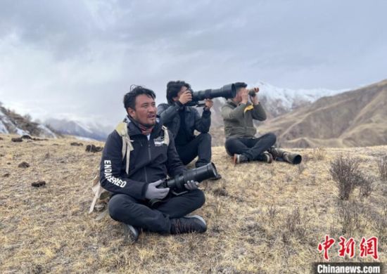 資料圖為3月22日,達(dá)杰(左一)與其他牧民攝影師一同拍攝野生動(dòng)物。 中新社記者 李江寧 攝