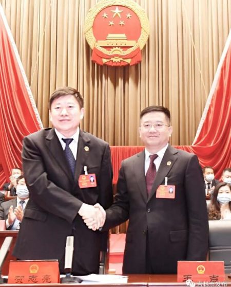 圖為市委書記賀志亮(左)和新當(dāng)選的市長(zhǎng)王吉握手