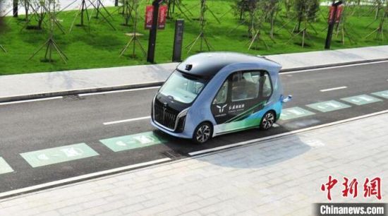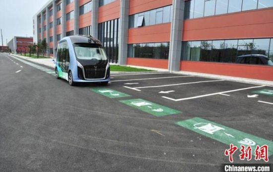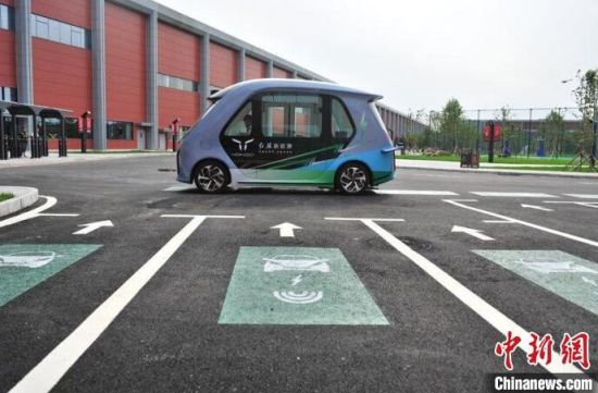 一輛新能源電動車駛過高功率動態(tài)無線充電道路系統(tǒng)的泊車位。
