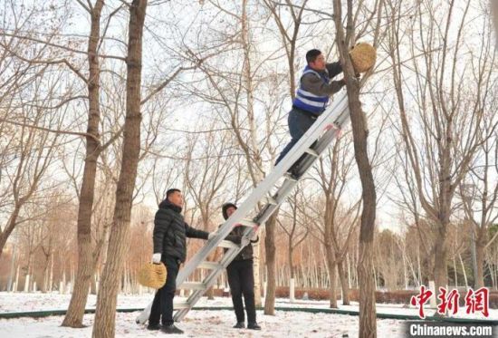 11月23日,趁著雪后天晴,吉林長(zhǎng)春友誼公園的工作人員忙著維護(hù)樹(shù)上的草編鳥(niǎo)巢,并投放了鳥(niǎo)糧。該公園生態(tài)環(huán)境好、野生鳥(niǎo)類多,園方已經(jīng)連續(xù)三年在園區(qū)設(shè)置百余個(gè)草編鳥(niǎo)巢助鳥(niǎo)類安全過(guò)冬。