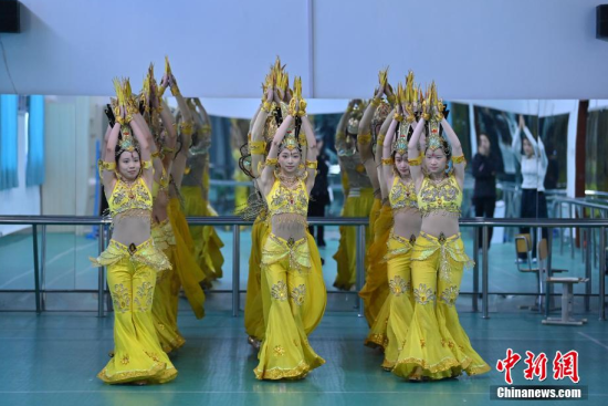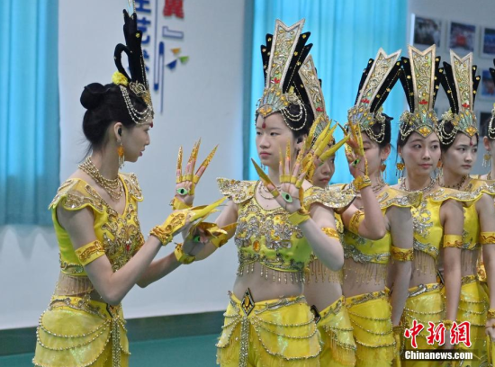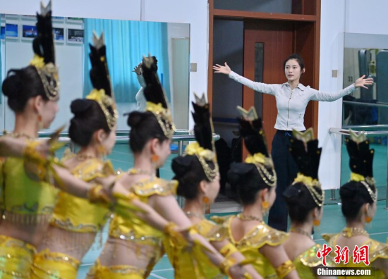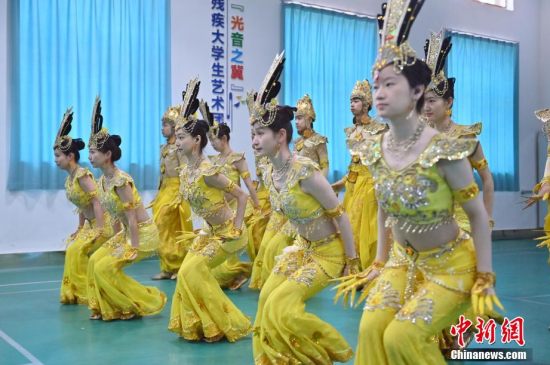 4月22日,在長春大學(xué)特殊教育學(xué)院,學(xué)生們在排練《千手觀音》。這所學(xué)院擁有一支由29名聽障學(xué)生組成的舞蹈團隊。他們因?qū)ξ璧傅臒釔鄱奂谝黄,在無聲的世界中舞出他們精彩的人生篇章。中新社記者 張瑤/攝