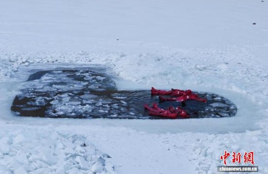 2月5日,吉林省長春市,一項獨特的冰浮項目吸引眾多游客前來體驗。在嚴寒天氣中,參與者身穿醒目的紅色浮力裝備,悠然漂浮于冰面之上,感受別致的冰雪樂趣。圖為游客在下水前拍照留念。中新社記者 張瑤 攝