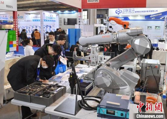 3月27日,第17屆長春先進(jìn)裝備制造業(yè)博覽會展出大量工業(yè)機(jī)器人!≈行律缬浾 張瑤 攝